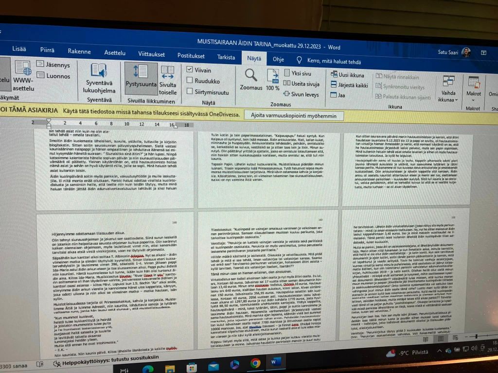 Eilen tein pitkän päivän kirjallisia töitä. ”Muistisairaan äidin tarina” – kirja, valmistui vihdoin ja lähetin sen oikolukuun ja kommenteille. Kun saan palautteen, teen ehdotetut korjaukset ja sitten on valokuvien aika ja sisällysluettelon. Vielä pitäisi tutkia ja päättää, minkälaisena kirja toteutetaan. Olen kallistumassa ”lukulisenssi” vaihtoehtoon, mutta en tiedä vielä asiasta tarpeeksi, joten nähtäväksi jää, miten asian ratkaisen. Kirja on kuitenkin tulossa.